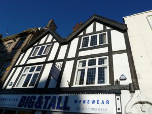 “Squire Alarms” burglar alarm, Nottingham • How perfect is this? An alarm named after a medieval land-holder, sitting on a Tudorbethan clothes emporium for the larger man in the ancient crime hot-spot of Nottingham. And the unusual black-and-white alarm even matches the half-timbered shop (pictured below) – maybe they chose it specially. In the middle…